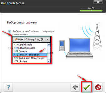4) Выбираем своего сотового оператора с которого устанавливаем интернет соединение. На данном примере это MTS Russian Federation а вы выбираете своего оператора сети. Далее подтверждаем кнопкой галочкой и автоматически начинается интернет соединение на вашем компьютере.